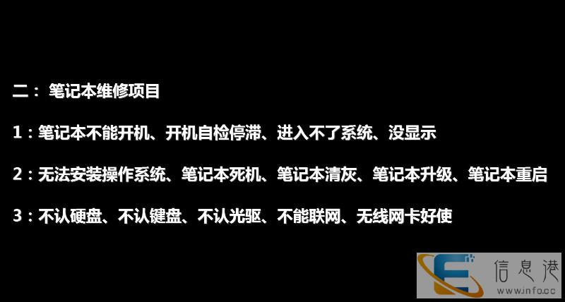一: 台式机维修项目1:操作系统的安装及调试、安装win7、win8系统、xp系统、驱动安装2:电脑自动关机、开机自检停滞、开机没反应、开机速度慢、开机出错、开机报警、无法开机、整机清灰3:电脑主板、显卡、电源、硬盘、内存、等硬件故障检测维修及更换 4:电脑组装、升级、免费提供攒机方案、二手台式机出售、二手显示器出售5:键盘失灵、鼠标失灵、不能上网 、电脑没有声音、麦克风没有声音、对方听不见、网页打不开6:系统瘦身、电脑减肥、C盘深度清理、系统优化、重启、黑屏、蓝屏、花屏、死机二: 笔记本维修项目1:笔记本不能开机、开机自检停滞、进入不了系统、没显示2:无法安装操作系统、笔记本死机、笔记本清灰、笔记本升级、笔记本重启3:不认硬盘、不认键盘、不认光驱、不能联网、无线网卡好使三:网络维护维修项目1:局域网打印机共享设置、网络组建与维护、无线网桥接、网络IT外包2:处理各类不能上网 路由器安装调试、无线网络调试、WiFi密码忘记3:网络总是掉线、不稳定、只能上QQ不能打开网页四:监控维护维修项目1:监控升级 监控摄像头不显示 硬盘录像机报警 监控线路更换